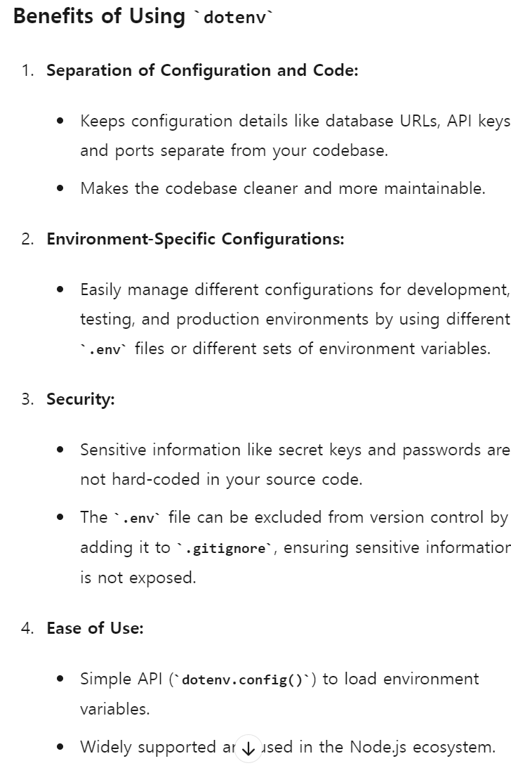 - **Step 4:** When you run the application, `dotenv` loads the environment variables, and the application can use them to configure the server port, connect to the database, or handle secret keys securely.